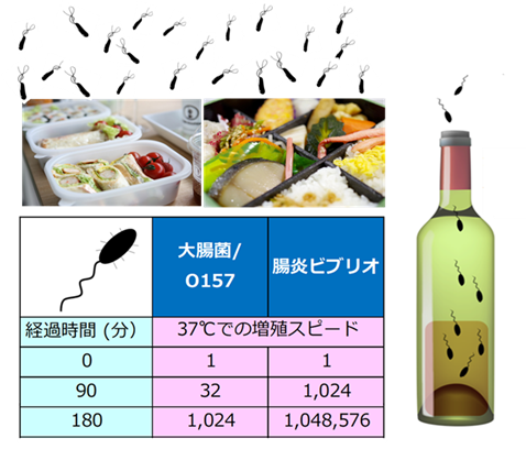 清潔に保たれている調理場ですら、わずか5分間にお弁当箱内に50~100個、ボトル内には3~6個の落下細菌が混入します。たった一つの菌が37℃の環境では3時間後にO-157は1,000個以上、腸炎ビブリオは100万個に繁殖します。