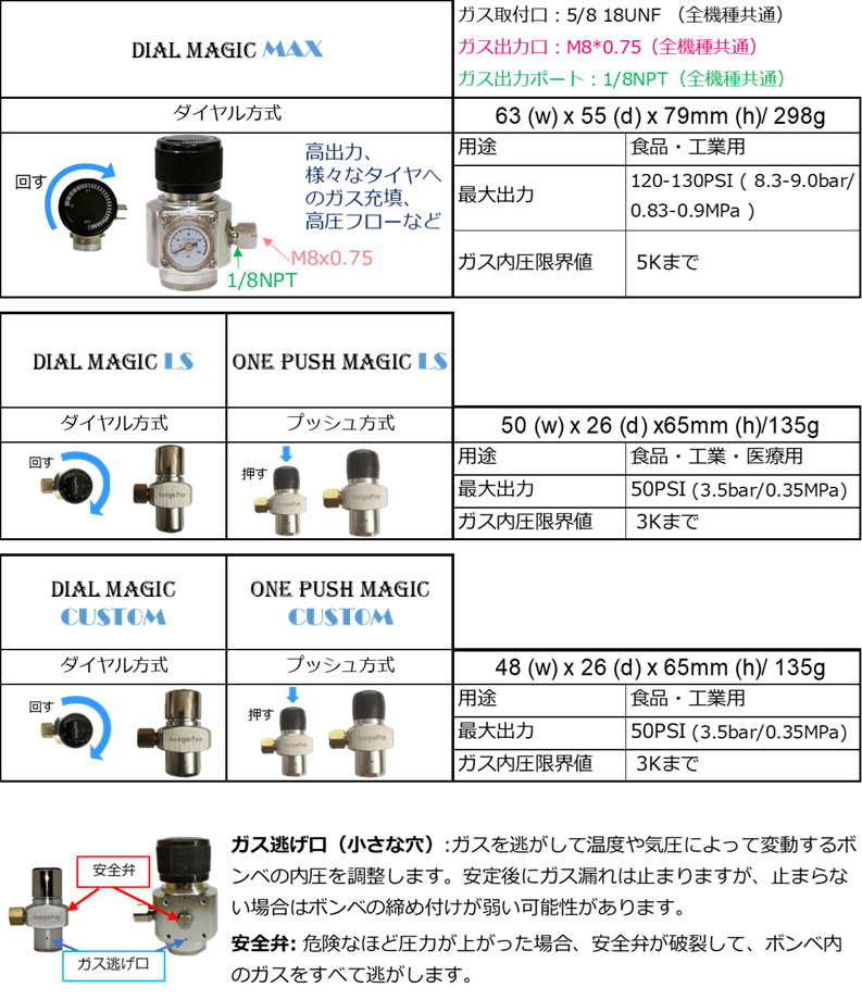 - ガス出力口サイズ:M8x0.75(米国メス)