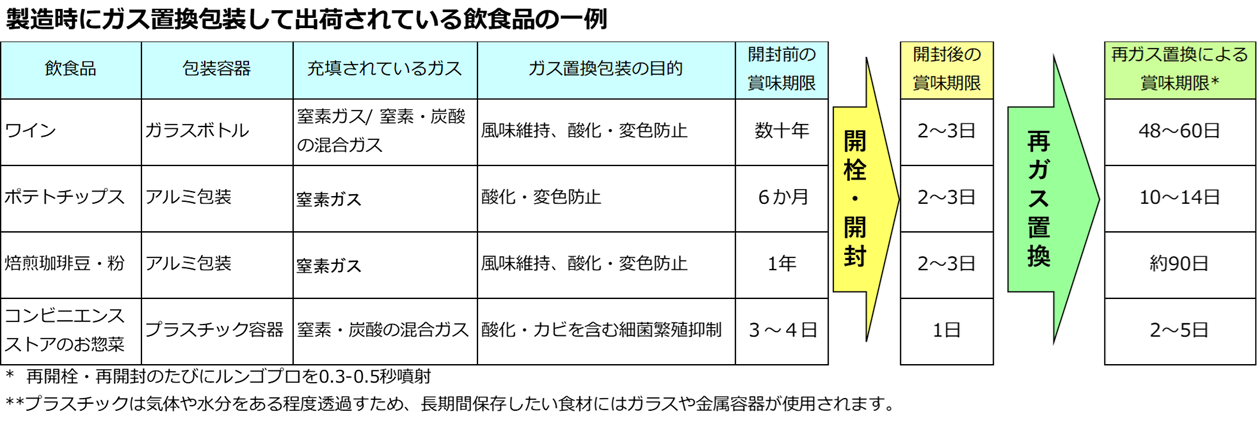 - また折角、ガス置換包装されている飲食品も食品の使用者が開封すると、すぐに劣化が進行します。