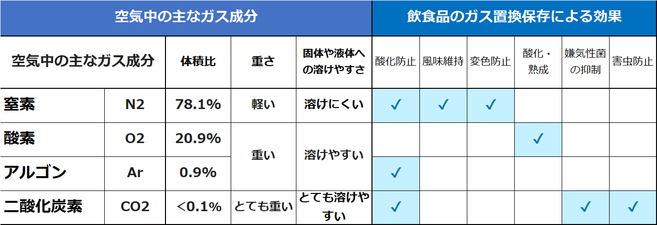 各気体はガス置換包装・保存で使用されますが、二酸化炭素やアルゴンは比重が重く、そして固体や液体に非常に溶けやすく浸透するため、酸化抑制には高い効果を発揮しますが、浸透による分子構成の変化により風味や色など性質に影響を与えます。