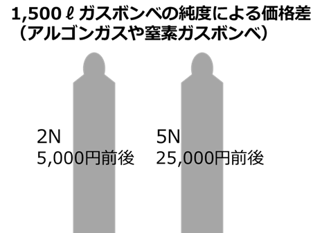 ガスの純度は“N”で表現され、1Nは純度90%、2Nは99%、4Nは99.99%など。精製純度が少しでも上がるだけでも価格は極端に上昇します。