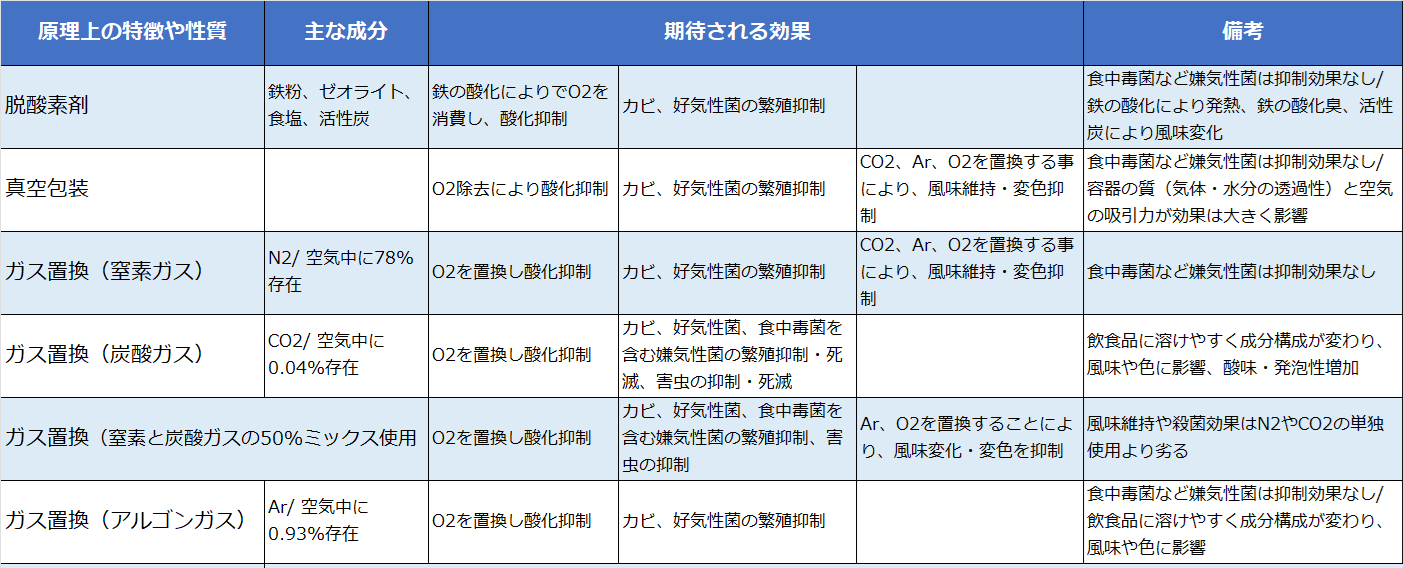 【飲食品の酸化防止方法の原理比較】